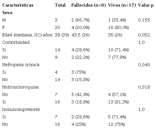 En la Tabla 2 se comparan las características de los fallecidos y vivos. Tres de los cuatro (75%) que tenían nefropatía crónica fallecieron en comparación de 3 (15,8%) de 19 que no lo tenían, la diferencia fue significativa. De los 7 que no recibieron hidroxicloroquina, tres (42,9%) fallecieron en comparación a cuatro (18,8%) de 16 que, si recibieron, la diferencia no fue significativa. Tabla 2