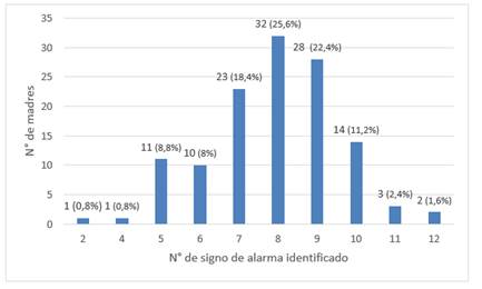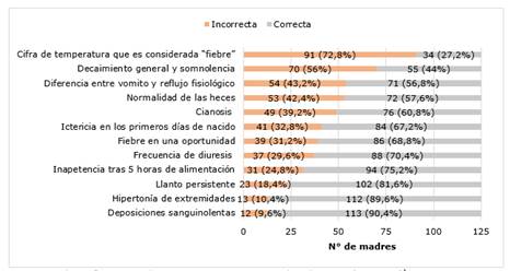 Entre los signos de alarma mejor identificados se encontró que la presencia de sangre en heces fue identificada por 113 madres (90,4%), hipertonía de extremidades por 112 (89,6%) y llanto persistente por 102 (81,6%). El 75.2% (n=94) reconoció como anormalidad la inapetencia del recién nacido luego de haber transcurrido 5 horas de la última alimentación con leche materna, el 70,4% (n=88) consideró como anormal que el recién nacido solo presente diuresis en 2 oportunidades durante 24 horas, el 68,8% (n=86) aseguró que la presencia de fiebre en una oportunidad en el recién nacido es un motivo para consulta a un centro asistencial de inmediato, el 67,2% (n=84) afirmó que la coloración amarillenta de la piel del recién nacido durante los primeros días no es normal, el 60.8% (n=76) consideró como señal de alarma inmediata el hecho que su hijo se ponga azulado unos segundos a pesar de ser solo en una oportunidad, el 57,6% (n=72) aseguró conocer la diferencia entre deposiciones normales y la diarrea, el 56.8% (n=71) aseveró conocer la diferencia entre vomito y reflujo fisiológico.