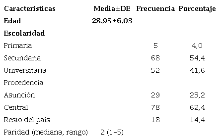 Se estudiaron 125 puérperas entre 19 a 42 años de edad (media: 28,9± 6 años), la escolaridad de las madres fue en el 54% secundaria y 41,6% universitaria, 62,4% era del departamento Central. La paridad osciló entre 1 a 5 (mediana: 2). Tabla 1