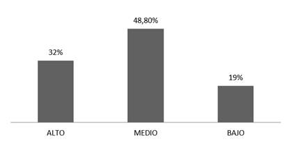 Se encontró que el 19% (n=24) obtuvo 1 a 9 puntos, lo que representa un bajo nivel de conocimiento, el 48,8% (n=61) obtuvo 10 a 12 puntos, lo que representa un nivel medio de conocimiento, mientras que el 32,2 % (n=40) de las puérperas obtuvo un puntaje de 13 a 16, lo que implica un alto nivel de conocimiento. En la figura 2 se presenta el nivel de conocimiento de las puérperas de alojamiento conjunto sobre los cuidados del recién nacido.