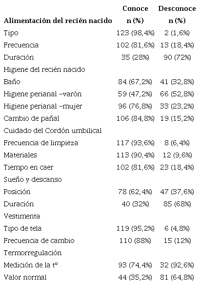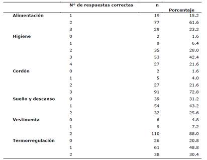 Se estudiaron 125 puérperas entre 19 a 42 años de edad (media: 28,9± 6 años), la escolaridad de las madres fue en el 54% secundaria y 41,6% universitaria, 62,4% era del departamento Central. La paridad osciló entre 1 a 5 (mediana: 2). En la Tabla 1 se presenta la frecuencia de respuestas correctas e incorrectas de las puérperas sobre el cuidado del recién nacido.