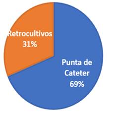 Se obtuvo crecimiento de gérmenes en muestras de cultivos realizados a pacientes con sospecha de infección asociada a catéter venoso central en un 16,2% (32/198) de los cuales un 68,7% de los pacientes (22/32) se aisló microorganismos en cultivo de punta de catéter y en 31% pacientes (10/32) fue en retrocultivos. Figura 1.