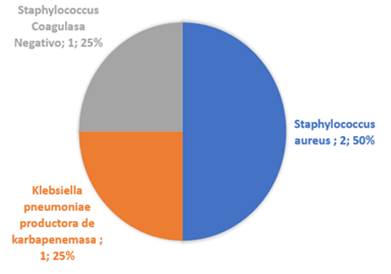 En la Unidad de Cuidados Intensivos Pediátrica del Hospital Alemán Nicaragüense11, se aisló por medio de cultivo de punta de catéter en un paciente dos gérmenes que fueron el Enterobacter cloacae y Proteus mirabilis, y en otro paciente Pseudomona spp.; los cuales recibieron terapia antimicrobiana a las que fueron sensibles y los pacientes evolucionaron satisfactoriamente. El microorganismo más frecuente fue el S. aureus con 28,1% seguido de la Klebsiella pneumoniae en el 18,8% en Hospital Luis Vernaza en el 201712. En este estudio se aisló con mayor frecuencia el Staphylococcus coagulasa negativa. En general se reporta que los estafilococos coagulasa negativos causan aproximadamente la mitad de todas las infecciones del torrente sanguíneo relacionadas con el CVC en los recién nacidos16. Otros patógenos incluyen bacilos gramnegativos (principalmente bacilos entéricos), cocos grampositivos (Staphylococcus aureus, enterococci) y hongos (predominantemente especies de Candida)17-18.