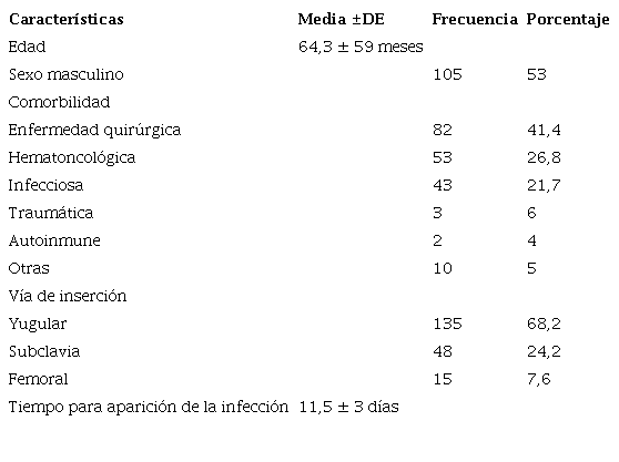 Durante el periodo de estudio se encontraron 198 pacientes hospitalizados en sala común de pediatría que requirieron colocación de catéter venoso central durante el periodo comprendido entre abril del 2020 a abril del 20202. La edad comprendida era de 1 mes a 15 años con una media de 64,3 ± 59 meses, 105 pacientes (53%) era del sexo masculino, el 41,4% (n=82) poseía alguna enfermedad quirúrgica, el 26,8% (n=53) hematoncológica, el 21,7% (n=43) infecciosa. La vía de inserción predominante fue la yugular en un 68,2% (n=135). El tiempo entre la inserción de la vía y la aparición de la infección asociada fue de 7 a 21 días con una media de 11,5 ± 3 días. Tabla 1