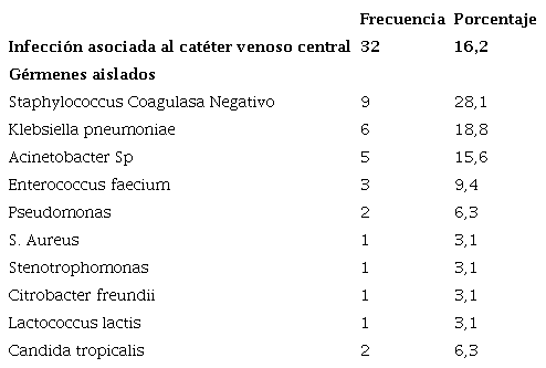 El 16,2% (n=32) desarrolló infección asociada al catéter venoso central. Los gérmenes aislados con mayor frecuencia fueron Staphylococcus Coagulasa Negativo en el 28,1% (n=9), Klebsiella pneumoniae (18,8%), Acinetobacter sp (15,6%). De esta población el 12 % (4/33) presentó bacteremia concomitante con aislamiento en hemocultivos de mismos gérmenes aislados en el catéter venoso central, los cuales fueron en mayor frecuencia Staphylococcus aureus en 2 pacientes, Klebsiella pneumoniae productora de carbapenemasa en 1 paciente y Staphylococcus Coagulasa Negativo en otro paciente. Figura 2.