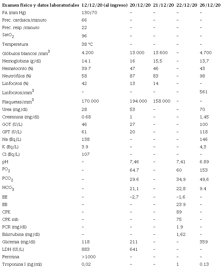 Fue tratado con ceftriazona 2 g/día por 10 días, levofloxacina 750mg por 10 días, dexametasona 8 mg cada 8 horas, salbutamol aerosol, fluticasona en aerosol, oxigeno con mascarilla facial por reservorio. En el día 21 de enfermedad presenta empeoramiento de la disnea, necesidad de asistencia respiratoria mecánica. Al ingreso el paciente presento glóbulos blancos dentro de valores normales que posteriormente fueron aumentando y se interpretó que se relacionaba con una infección bacteriana intrahospitalaria asociada por el cual recibió una cobertura antibiótica con antibiótico de amplio espectro. El hemocultivo fue negativo, la serología para hepatitis A,B,C, y enfermedad de Chagas fue también negativa. El electrocardiograma no mostró alteraciones patológicas. La radiografía de tórax evidenció infiltrado intersticial bilateral, la tomografía de tórax de alta resolución mostró infiltrado intersticial bilateral. Es trasladado a un centro de cuidados intensivos especializado en la atención de pacientes con COVID -19, cinco días después fallece de una falla multiorgánica. En la Tabla 1 se presentan los resultados al examen físico y pruebas laboratoriales.