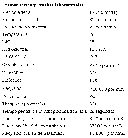 Evolución: La paciente fue tratada con pulsos de metilprednisolona 1g/3 días, seguida de prednisona oral, con buena respuesta con recuperación de las plaquetas. El anticuerpo anti factor 4 plaquetario no se realizó, no se procesa en el país. La paciente presentó buena evolución. La paciente se negó a recibir la segunda dosis de la vacuna Astra Zeneka.