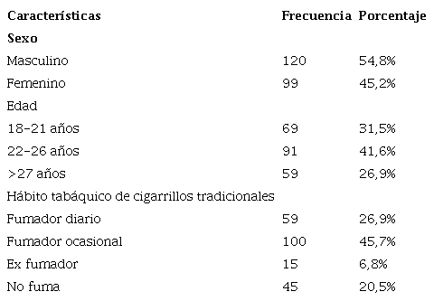 Las características de los estudiantes que reconocieron utilizar CE se muestran en la Tabla 1. El 54,8% era del sexo masculino, y 41,6% tenía entre 22 - 26 años. En relación al hábito tabáquico el 26,9% manifestó ser fumador diario y el 45,7% ser fumador ocasional.