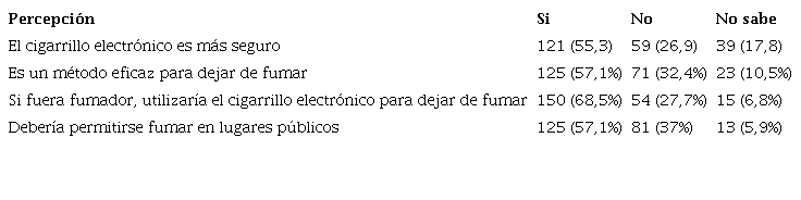 En relación a la percepción del uso de cigarrillos electrónicos: el 41,0% considera que los CE son seguros, el 57,1% afirmó que es un método eficaz para dejar de fumar, el 68,5% que utilizaría el CE para dejar de fumar y el 57,1% que se debería permitir su uso en lugares públicos.