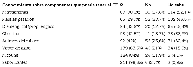 En cuanto al conocimiento sobre los componentes del CE 63,5% refiere estar compuesto por vapor de agua, 96,3% de saborizantes, 84% de nicotina, 42,5% glicerina, 42% de aditivos del tabaco, 43,4% no sabe si se encuentra o no el Dietilenglicol/propilenglicol, 52,1% no sabe si cuenta con nitrosaminas, 46,6% no sabe si cuenta con metales pesados. Un porcentaje importante de alumnos «desconoce» o considera que «no tienen» en su composición dietilenglicol/propilenglicol (57,1%), glicerina (57,5%) y nicotina (16%) entre otros compuestos que se han descrito que pueden estar presentes.