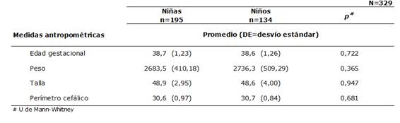 Fueron calculados los promedios de las medidas antropométricas de peso, talla, PC y de la edad gestacional, todas divididas por sexo, con el desvío estándar correspondiente; no se encontró diferencia significativa entre los promedios de acuerdo al sexo. Tabla 1