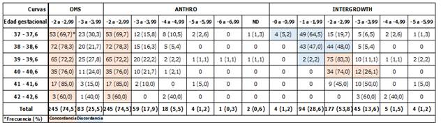 Para medir la concordancia se tomó como parámetro oro a las curvas de referencia de la OMS (2007) comparándolo con el puntaje Z obtenido con los aplicativos Anthro WHO e Intergrowth 21st.