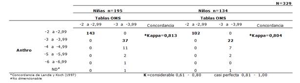 Se midió el grado de acuerdo entre las tablas de referencia de la OMS y Anthro WHO, encontrando un Kappa=0,813 de casi perfecto para las niñas y un acuerdo Kappa=0,804 considerable para los niños, tabla 3.