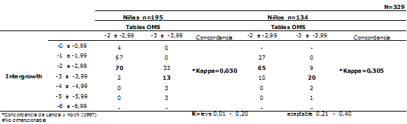 Se calculó el grado de acuerdo entre las referencias OMS e Intergrowth 21st, encontrando un Kappa=0,030 leve para las niñas y un Kappa=0,305 aceptable para los niños. Tabla 4