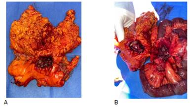Se sometió a laparotomía exploradora de urgencia, con hallazgo operatorio de proceso tumoral estenosante y ulcerado de 5cm en el colon transverso, con rotura de la cara posterior del colon (Figura 1A) e invasión de la raíz del mesenterio (Figura 1B) y del yeyuno proximal, a unos 10 cm del ángulo de Treitz, con compromiso de adenomegalias en todo el mesenterio; se realizó resección tumoral en bloque más vaciamiento ganglionar del eje mesentérico quirúrgico.