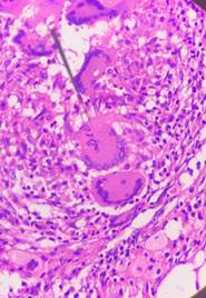 Paciente masculino 65 años, portador de Hipertensión arterial, obesidad Grado I, no diabético, con cuadro de Covid-19 de 10 días de evolución, tratado en forma ambulatoria, sin mejoría. Acudió al Servicio de Urgencias del Hospital de Especialidades Quirúrgicas Ingavi (HEQI) del Instituto de Previsión Social (IPS) por dificultad respiratoria en forma progresiva, constatándose requerimiento de oxigenoterapia, por lo que se decidió su internación. Fue trasladado a sala de Unidad de Terapia Intensiva, para monitorización hemodinámica y soporte ventilatorio. En contexto a Síndrome de Distrés Respiratorio Agudo asociado a Covid-19, fue conectado a Asistencia Respiratoria Mecánica (ARM); se procedió a pronación; recibió tratamiento médico según protocolo con dexametasona (8mg/EV/día) y profilaxis con Heparina de bajo peso molecular (0,5mg/Kp/día). Presentó en los primeros días respuesta favorable, con mejoría de parámetros ventilatorios. se objetivó descenso de hemoglobina y sangrado por tubo digestivo (melena) 1 mes después del inicio del tratamiento; se realizó Endoscopia Digestiva Alta (EDA) sin alteraciones significativas; luego colonoscopía donde se observaron lesiones de aspecto neoplásico en colon ascendente, tumoración protruyente en ciego con estigmas de sangrado reciente. El retorno de informe de anatomía patológica concluyó: “material necroinflamatorio y fragmentos de tejido de granulación, no observando mucosa colónica viable ni proceso neoplásico maligno; presencia de estructuras micóticas compatibles morfológicamente con mucormicosis”, imágenes observadas con coloración de rutina (Hematoxilina y Eosina).