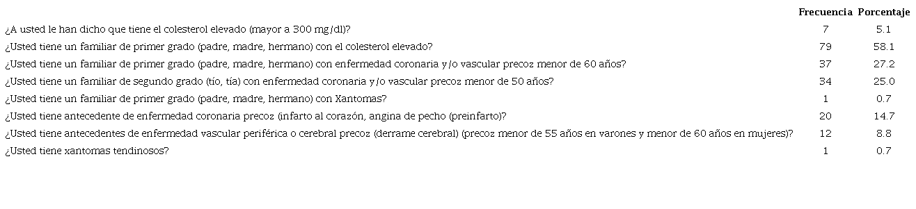 En la población existía la presencia de antecedente familiar patológico en 60% de los participantes (Ver Tabla 2), resaltando que entre 5 al 40% de este subgrupo no se había realizado una evaluación cardiovascular (Ver Tabla 3), aun siendo recomendado está a partir de los 18 años. Aun con la presencia de antecedente familiar reportado de hipercolesterolemia (58.1%) solo 0.7% de nuestra población (Ver Tabla 3) reportóhaber sido notificado sobre dichos resultados anómalos.