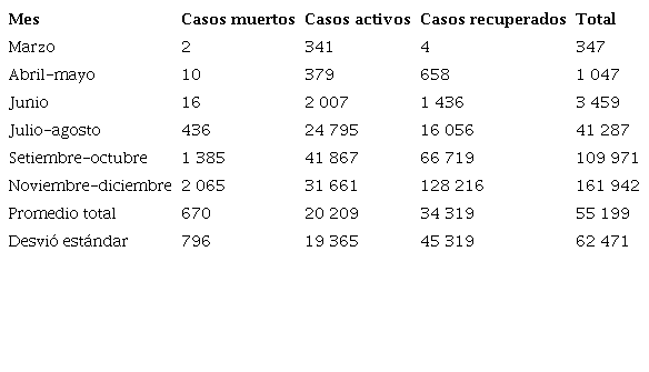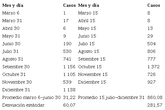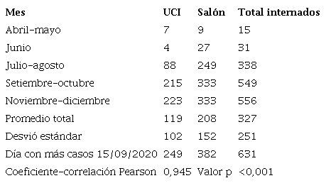 El primer caso confirmado en el país ocurrió el 6 de marzo 2020 y al 31/12/2020 se confirmaron 166 799. Los casos bimensuales indican que los promedios son menores en UCI y mayores en salones de internamiento. Hay correlación positiva casi perfecta (0,9423), que indica que la mayoría de los días, si aumentaban los casos en UCI, también aumentaban en salones, hay mayor variabilidad en salones, siendo la desviación estándar 152 casos. Tabla 1.