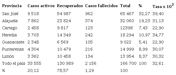El número total fue significativamente mayor en San José comparado con las otras provincias (p <0,00001), le siguen Alajuela, Heredia, Puntarenas, Limón, Cartago y Guanacaste. Respecto al lugar de confirmación de los casos,138 311 (82,92 %) se realizó por laboratorio clínico y 28 488 (17,07 %) por nexo epidemiológico. En relación con la variable epidemiológica persona, la nacionalidad costarricense fue en 144 975 (86,91%) y otra nacionalidad en 21 824 (13,08%). Tabla 4.