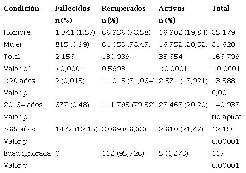 La muerte fue significativamente mayor en hombres, el número de recuperados fue similar en mujeres y hombres, activos levemente mayores en hombres y en el total hubo más casos en hombres. La edad de fallecidos es en promedio 70,7 años. La muerte en menores de 20 años es de un 0,093 %, en los de 20-64 años es el 31,40 % y en los de 65 y más años es de un 68,51 %. Los casos en menores 20 años, 65 y más años, de edad ignorada son significativamente menores que de 20-64 años. Tabla 5