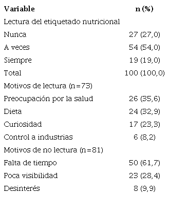 El 73% de la muestra refirió leer el etiquetado nutricional de alimentos, resaltando que la opción más frecuente fue a veces. De los 73 encuestados que manifestaron leer el etiquetado nutricional de alimentos, la mayoría refirió hacerlo debido a la preocupación por la salud de su familia y por estar a dieta. Respecto a los motivos de no lectura, tanto en quienes manifestaron nunca leer como en los que a veces lo hacen (n=81), más de la mitad refirió que la principal barrera es la falta de tiempo, seguida de que el tamaño y la ubicación del etiquetado en el envase impide una buena visibilidad del mismo (Tabla 1).