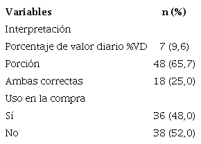 La interpretación y el uso fue evaluado en los encuestados que manifestaron leer “a veces” y “siempre” el etiquetado nutricional de alimentos, lo que corresponde a 73 adultos; de estos solo un 25% interpreta correctamente ambos términos, si bien, al evaluar de manera independiente, el término “porción” es interpretado por el 66% de los mismos. El uso del etiquetado nutricional de alimentos en la selección y decisión de compra de alimentos, la mayoría manifestó no tenerlo en cuenta (Tabla 3).