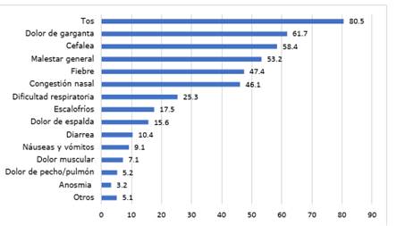 La Figura 1, revela que la tos fue el síntoma más frecuente, se presentó en el 80,5% de pacientes con Covid-19, seguido del dolor de garganta con 61,7%, y cefalea con 58,4%. Y los síntomas menos frecuentes fueron la anosmia, dolor de pecho/pulmón, dolor muscular y náuseas/vómitos.