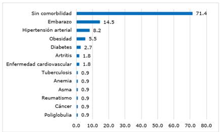 La Figura 2, revela que, el 71,4% no presentó comorbilidad, y los que presentaron correspondió al embarazo (14,5%), seguido de hipertensión arterial (8,2%) y obesidad (5,5%).