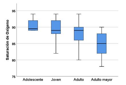 En la Figura 3, se visualiza la saturación de oxígeno por grupos de edad, donde en la etapa adolescente la mediana fue de 89,5, etapa joven 89, etapa adulta 89 y la etapa adulto mayor 85. Al compararlos se evidenció que a mayor edad disminuye estadísticamente (p < 0.05) el nivel de saturación de oxígeno, con una correlación negativa moderada entre la edad y la saturación de oxígeno con índice de correlación de Pearson de 0,466.