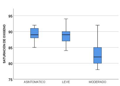 En la Figura 4, se visualiza la saturación de oxígeno según la clasificación clínica del COVID-19, donde en las categorías asintomática y leve la mediana fue de 89, y en la moderada 82. Al compararlos se evidenció que a mayor nivel de gravedad disminuye significativamente (p< 0,05) el nivel de saturación de oxígeno. Se observó correlación negativa moderada entre la gravedad y la saturación de oxígeno (índice de correlación de Spearman = -0,427431).