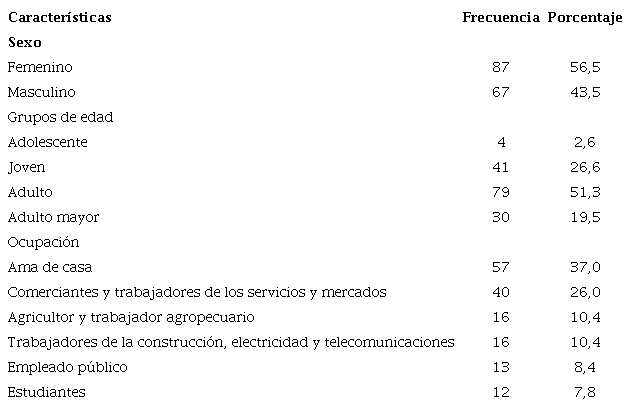Se incluyeron en el estudio 154 pacientes. La Tabla 1 evidencia que, del total de pacientes, resalta con mayor porcentaje el sexo femenino (56,5%), el grupo de edad de adultos (51,3%), y la ocupación ama de casa (37,0%).