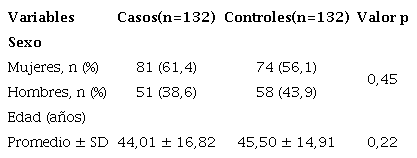 En base con el diseño y asumiendo la frecuencia de exposición entre los casos de 40% y en los controles de 20%8,9, fijando un odds ratio de 2 con nivel de seguridad de 0,95 y un poder de test de 80% se estimó que el tamaño mínimo de la muestra debía ser de 132 tanto en los casos como en los controles.