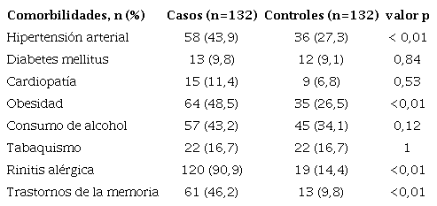 Cuando se compararon las frecuencias de las comorbilidades se observó que la proporción de hipertensión arterial, obesidad, rinitis alérgica y los trastornos de la memoria fueron diferentes entre los grupos, así como se observa en la Tabla 2.