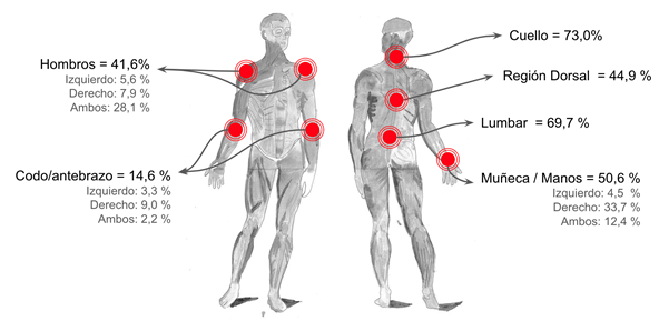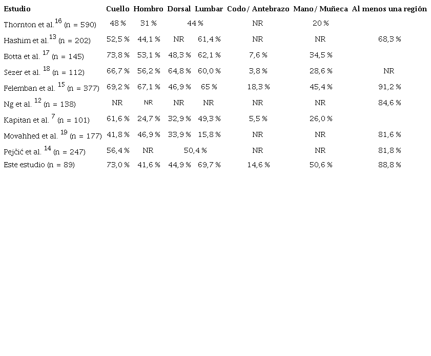 En el presente estudio, la región que más veces obligó a la reducción de actividades laborales fue la mano/muñeca, seguida de la región dorsal. En el caso de las actividades de ocio, las regiones anatómicas afectadas que obligaron a la reducción de estas actividades fueron la región lumbar (25,81 %) y la región de la mano y la muñeca (20 %). En estudiantes de Arabia Saudita, la región afectada que con más frecuencia impidió la realización de actividades diarias fue el dolor de hombros (18,8 %) seguido de dolor lumbar (18,6 %) y dolor de cuello (17 %)15.