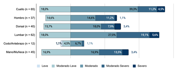 En el cuello se reportó más frecuentemente sintomatología de severidad moderada; en la zona lumbar se reportaron, además, niveles más severos. Sin embargo, la moda en cada región con sintomatología fue dolor moderado.