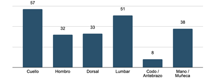En los últimos 12 meses, 74 (83,1 %) reportaron dolor en alguna región anatómica, 57 reportaron dolor en la zona del cuello y 51 en la zona lumbar (Figura 3).