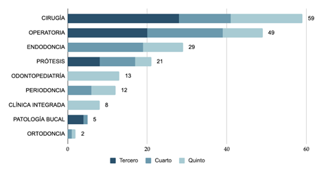 También se investigó sobre los procedimientos que causan mayores molestias luego de realizarse, y se encontró que las cátedras de Cirugía y Operatoria Dental eran las que causaban molestias con mayor frecuencia, posiblemente debido a las exigencias posturales que estas actividades requieren. En un estudio previo realizado en Serbia, se descubrió que los estudiantes experimentaban dolor musculoesquelético con mayor frecuencia durante procedimientos como el tratamiento endodóntico (59,2%), el raspaje y alisamiento radicular (13,1%), el trabajo con niños (9%), tratamientos de prótesis dentales (8,2%) y la preparación y colocación de empastes dentales (2%)14.