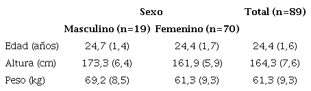Fueron encuestados 120 estudiantes de la Facultad de Odontología de la Universidad Nacional de Asunción del tercero, cuarto y quinto curso. Se excluyeron a 31 sujetos que respondieron afirmativamente haber sido diagnosticados con algún TME, presentar algún TME congénito y/o haber sufrido trauma que afectó al sistema musculoesquelético, quedando el tamaño de la muestra en 89 sujetos (32, 29 y 28 sujetos del tercero, cuarto y quinto curso, respectivamente). Las medias y desviaciones estándar del peso, edad y altura de los estudiantes se presentan en la Tabla 1.