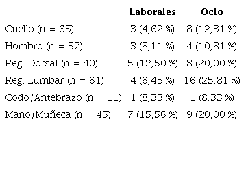 La frecuencia de estudiantes que reportaron reducir sus actividades laborales y de ocio debido a dolor fue de 12 y 21, respectivamente. La zona afectada que más veces obligó la reducción de actividades laborales fue la mano/muñeca (15,6 %), seguido por la región dorsal (12,5 %). En cambio, la zona afectada que más veces obligó la reducción de actividades de ocio fue el dolor en la zona lumbar (25,8 %), seguido por la mano/muñeca (20,0 %) Tabla 2.