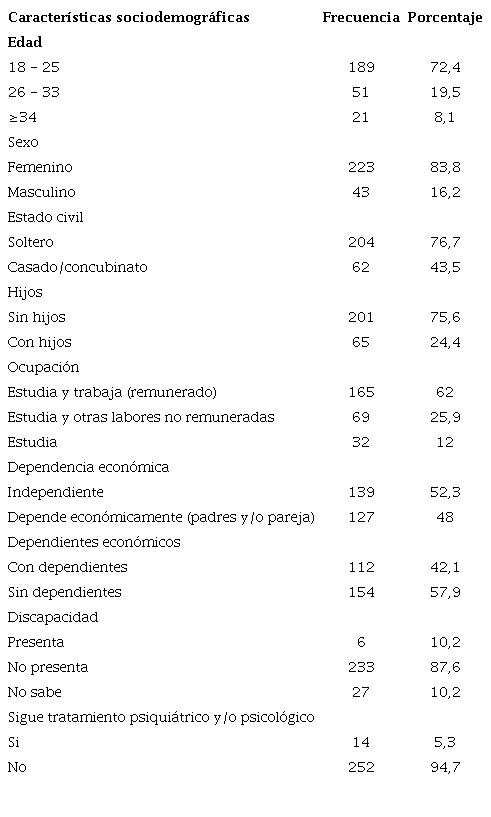 Se incluyeron en el estudio 266 estudiantes entre 18 y 48 años (mediana=21, amplitud intercuartílica=6), prevalece el género femenino (84%), estado civil soltero (76,3%) y sin hijos (75,6%). La mayoría trabaja además de estudiar (62%), el 47,7% e con dependencia económica y 42% tiene dependientes. Además, el 12% de los estudiantes refiere alguna discapacidad y 5% sigue tratamiento psicológico ni psicofarmacológico (Tabla 1).