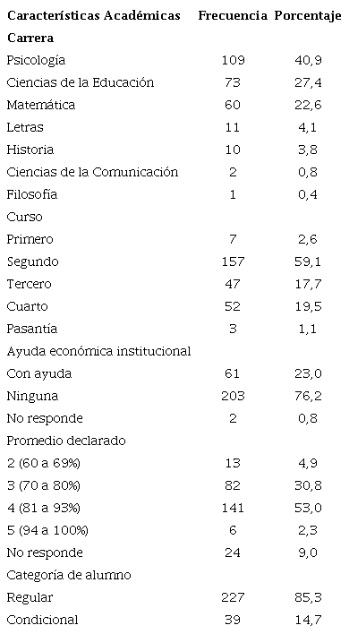 Hubo mayor participación de las carreras de Psicología (40,9%), Ciencias de la Educación (27,44%) y Matemática (22,56%), segundo curso (59,1%). El promedio académico más frecuente informado por los alumnos fue 4 (53%), la categoría de estudiantes de “alumno regular” (85%) y, sin ayuda económica institucional (76%). Tabla 2.