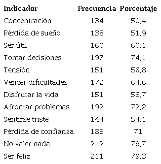 Los indicadores de trastornos mentales prevalecientes fueron: disminución del sentimiento de utilidad (60,1%); tensión y agobio (56,8%); menor capacidad de disfrute cotidiano (56,7%), como muestra la Tabla 3.