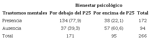 Se encontró una asociación altamente significativa (p<0,001) entre el bienestar psicológico y trastornos mentales, el 77,9% de los estudiantes que obtuvieron puntajes correspondientes a presencia de trastornos mentales presentaron niveles bajos de bienestar psicológico (≤ P25) comparado al 39,3% de los que no lo tuvieron. Tabla 4