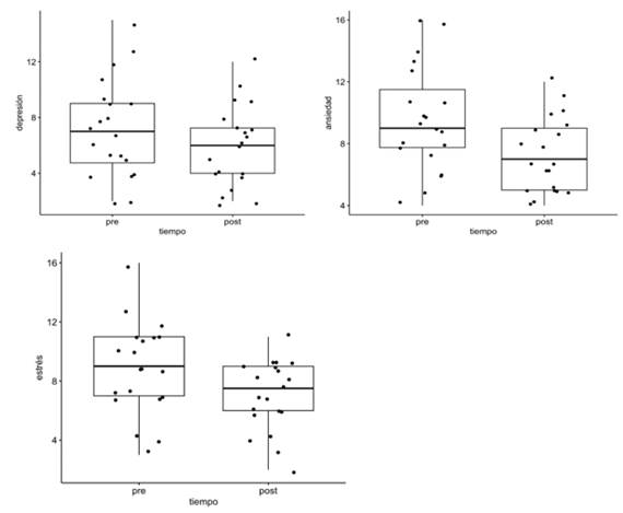 La prueba de rangos con signo de Wilcoxon para muestras pareadas indica que hubo una diferencia significativa en los puntajes de depresión pre-post v = 132, p<0.001, una diferencia significativa en los puntajes de ansiedad pre-post v = 153, p<0.001 y el estrés puntúa V= 120, p<0.001, demostrando así la efectividad del mindfulness para reducir estrés, ansiedad y depresión en estudiantes universitarios.