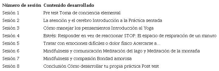 MBSR en línea ("Mindfulness-Based Stress Reduction"): El programa utilizado durante las 8 semanas es inspirado por Kabat-Zinn9. Los contenidos desarrollados a base de talleres de formación en MBSR en línea son 100% gratuitos, y están diseñados por un instructor certificado en MBSR. La implementadora de los talleres de esta investigación tiene experiencia en la implementación de mindfulness, y cuenta con formación en psicología.