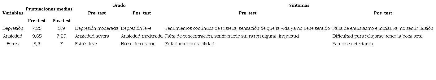 Se detectaron en el pre test ansiedad severa con síntomas fisiológicos, cognitivos, afectivos y conductuales tales como, dificultad para respirar, falta de concentración, sentir miedo sin razón alguna e inquietud. También depresión moderada relacionada a síntomas afectivos como sentimientos continuos de tristeza y sensación de que la vida ya no tiene sentido. Del mismo modo se detectó estrés leve que abarca síntomas conductuales como el enfado con facilidad. en el pos test se detectaron, ansiedad moderada y depresión leve correspondientes a síntomas fisiológicos, conductuales, cognitivos y afectivos, es decir; falta de entusiasmo e iniciativa, no sentir ilusión, dificultad para relajarse y tener la boca seca. En cuanto al estrés ya no se detectaron síntomas.