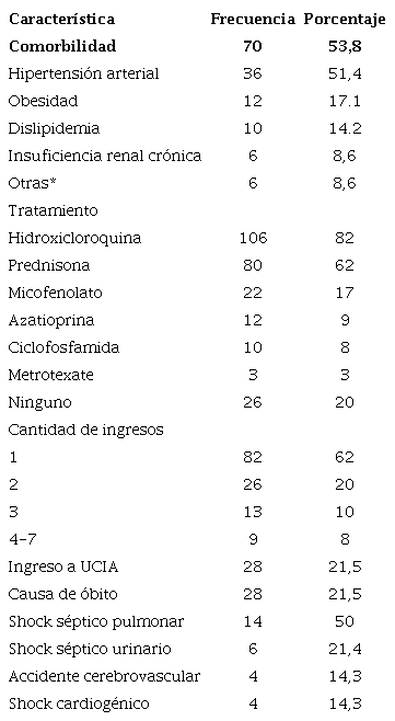 El 53,8% de los pacientes tenían alguna comorbilidad, siendo la hipertensión arterial la más frecuente (51,4%). El 82% de los pacientes recibían hidroxicloroquina y el 62% prednisona. El 62 % de los pacientes tuvo 1 internación. El reingreso fue en promedio 1,6 ± 1,1 (rango: 1-7). El 83,5% de las internaciones fue en sala de internación (clínica médica, cirugía, sala de ginecoobstetricia) y el 21,5% en UCIA. Todos los que ingresaron a UCIA fallecieron, de ellos, 50% por shock séptico de origen pulmonar. Tabla 1