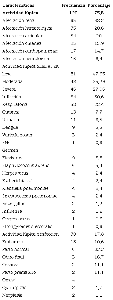 De las 170 internaciones registradas en los 3 años, el 74,7% fueron por actividad del LES, siendo la afectación renal (38,2%) la más frecuente. La actividad de la enfermedad fue leve en el 47,65% de los pacientes. Las infecciones constituyeron la segunda causa de internación (50,6%) siendo las respiratorias las de mayor frecuencia (22,4%). En el 22% se identificó el agente causal, 13,6% bacterias, 8,9% virus, 1,8% hongos, y 0,6% parásitos. Entre las bacterias se aislaron Staphylococcus aureus (3,5%), Escherichia coli, klebsiella pneumoniae, Streptococcus pneumoniae (2,4%), entre los virus; flavirus (5,3%), Influenza (1,2%), entre los hongos; Aspergillus (1,2%), Cryptococcus (0,6%), y entre los parásitos Strongyloides stercoralis (0,6%). En el 17,8 % hubo concomitancia entre la actividad del LES y las infecciones. El embarazo constituyó la tercera causa de internación (10,6%). Otras causas de ingreso al hospital fueron por patologías quirúrgicas (1,8%) y neoplasias (1,1%). Tabla 2