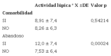 La comorbilidad del paciente no se relacionó severidad de la actividad lúpica (p=0,54214) pero si el abandono del tratamiento (p< 0,00024).