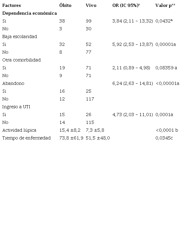 Los factores asociados a la mortalidad fueron dependencia económica (p =0,0432), la baja escolaridad (p <0,00001) el abandono del tratamiento (p< 0,0001) y el ingreso a UCIA (p < 0,0001), pero no la presencia de comorbilidad (p < 0,08359). La severidad de la actividad lúpica se relacionó con el óbito (p<0,0001) pero no el tiempo transcurrido de enfermedad (p<0, 0345).